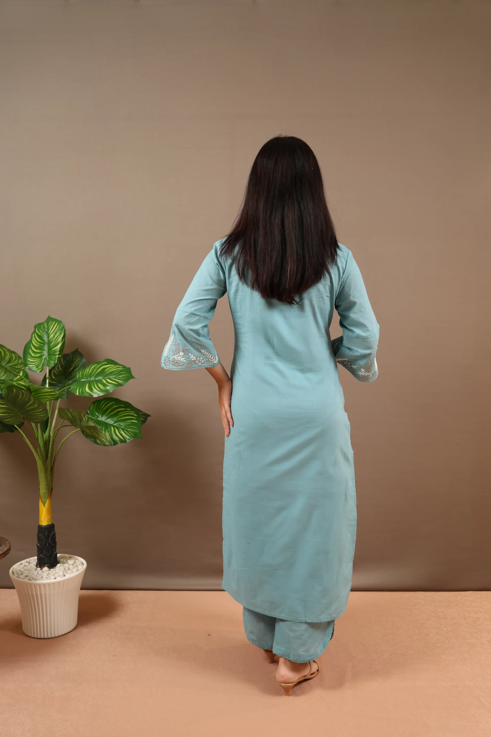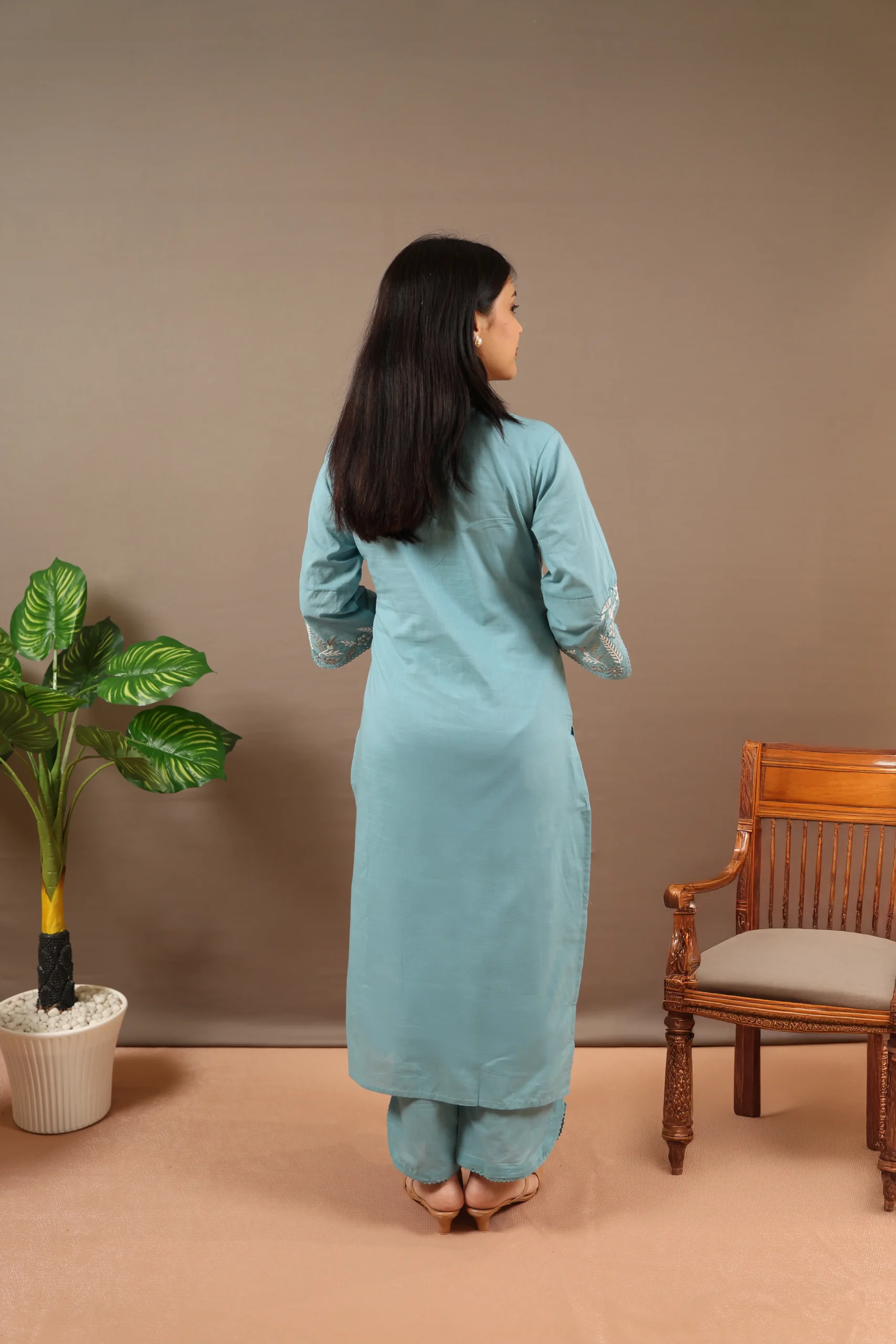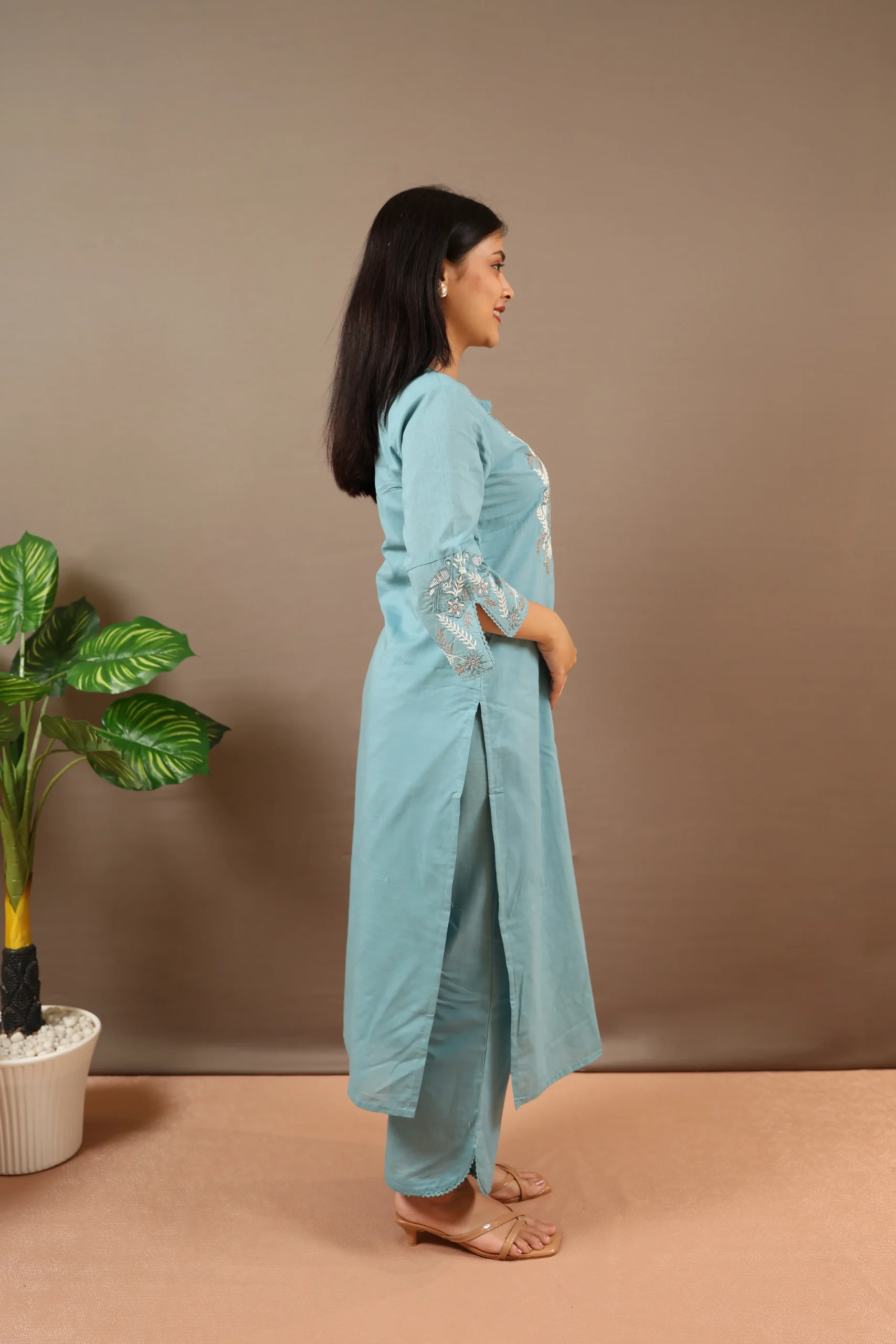 This Aky Blue straight-fit kurta set offers a comfortable and stylish option for everyday wear. The knee-length cotton kurta features embroidered and sequinned detailing, a classic round neck, and three-quarter sleeves, making it perfect for a clean and elegant daily look. It is paired with solid cotton pants featuring a partially elasticated waistband to ensure ease and comfort throughout the day. Made using machine-weave cotton, this set is soft, breathable, and ideal for regular use.