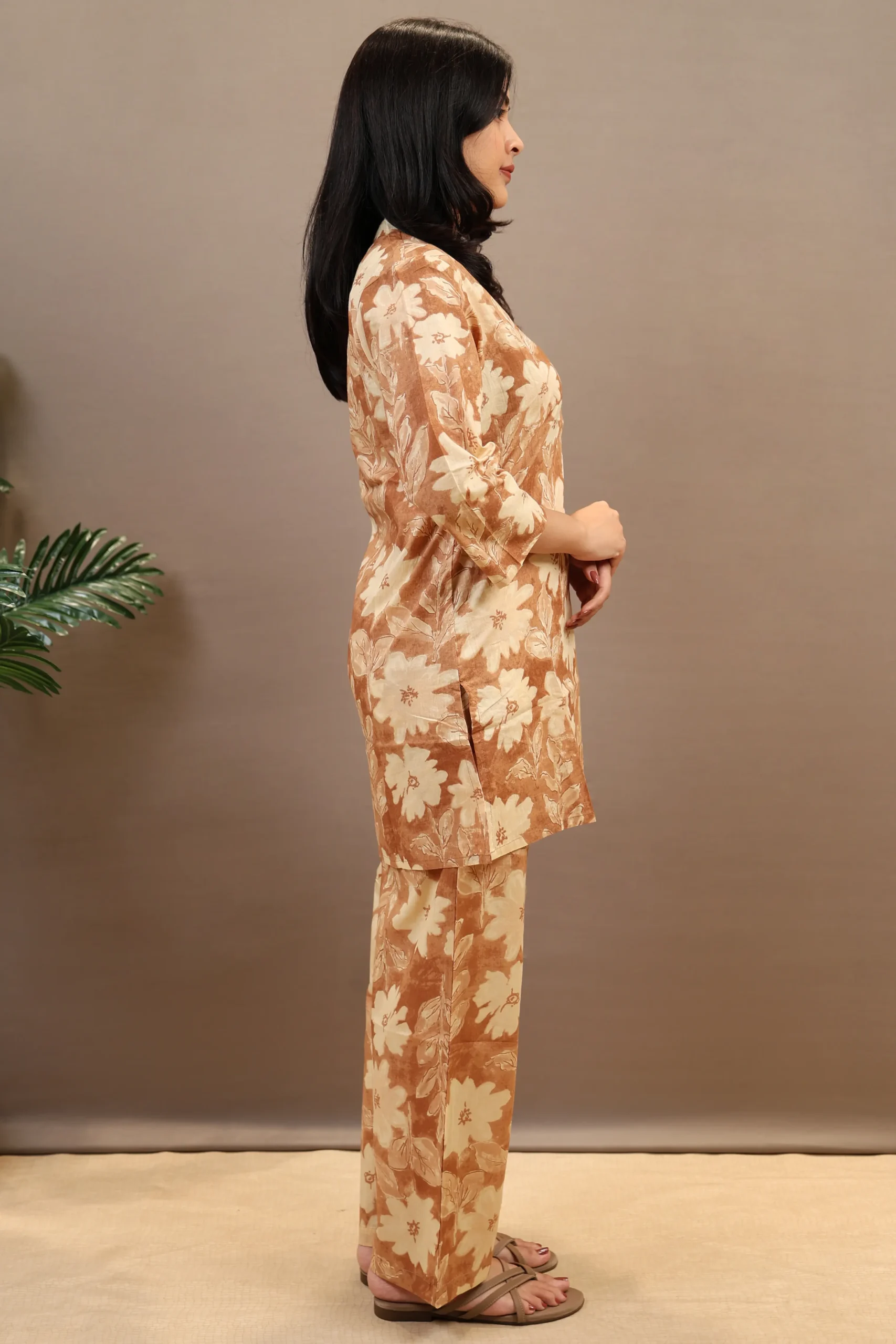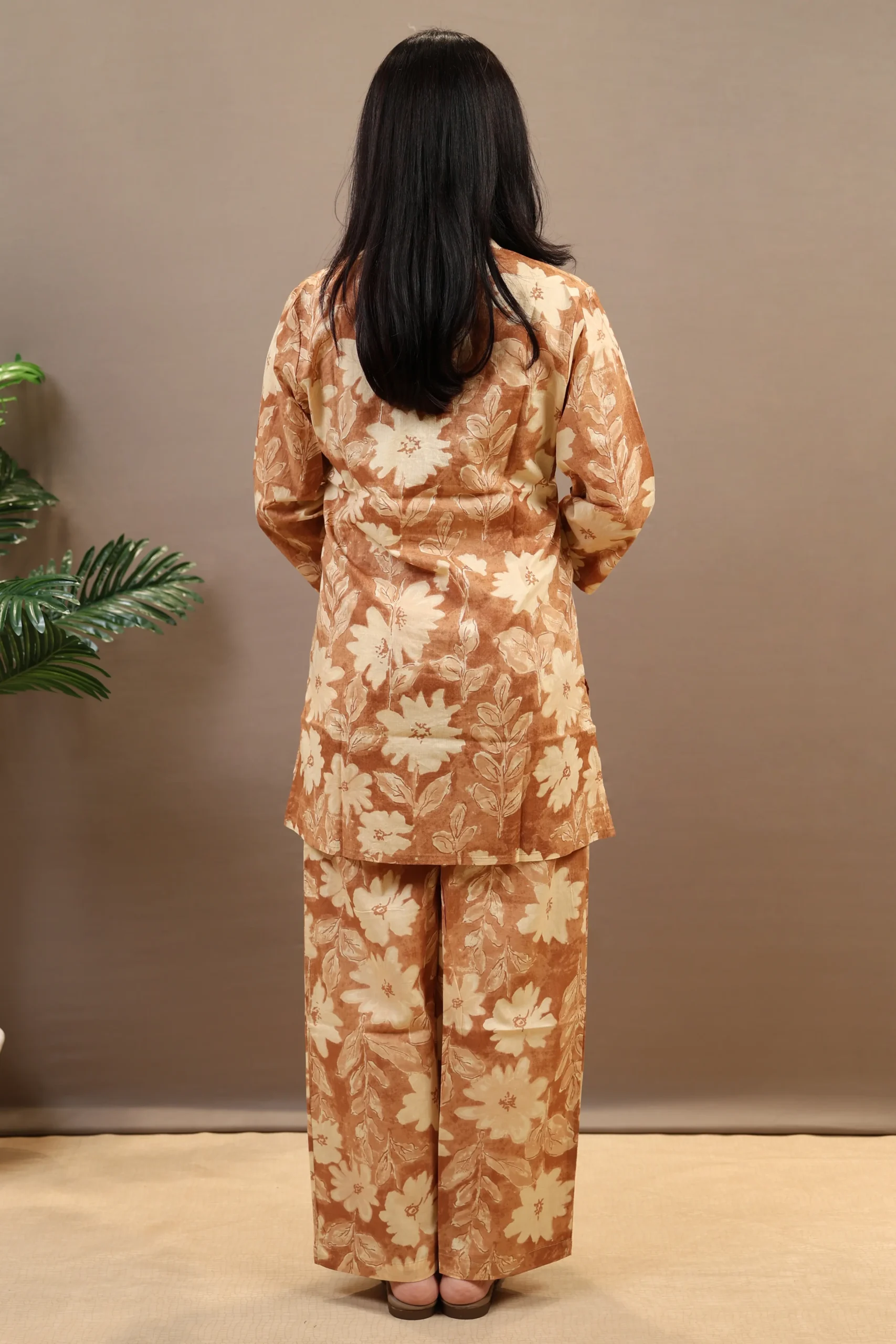 A Light Brown co-ord set featuring a short-length kurta with round neck and three-quarter sleeves. The printed top pairs with matching printed Plazo pants that have a partially elasticated waistband. Made from machine-woven cotton, this two-piece set offers comfort and style for daily wear.