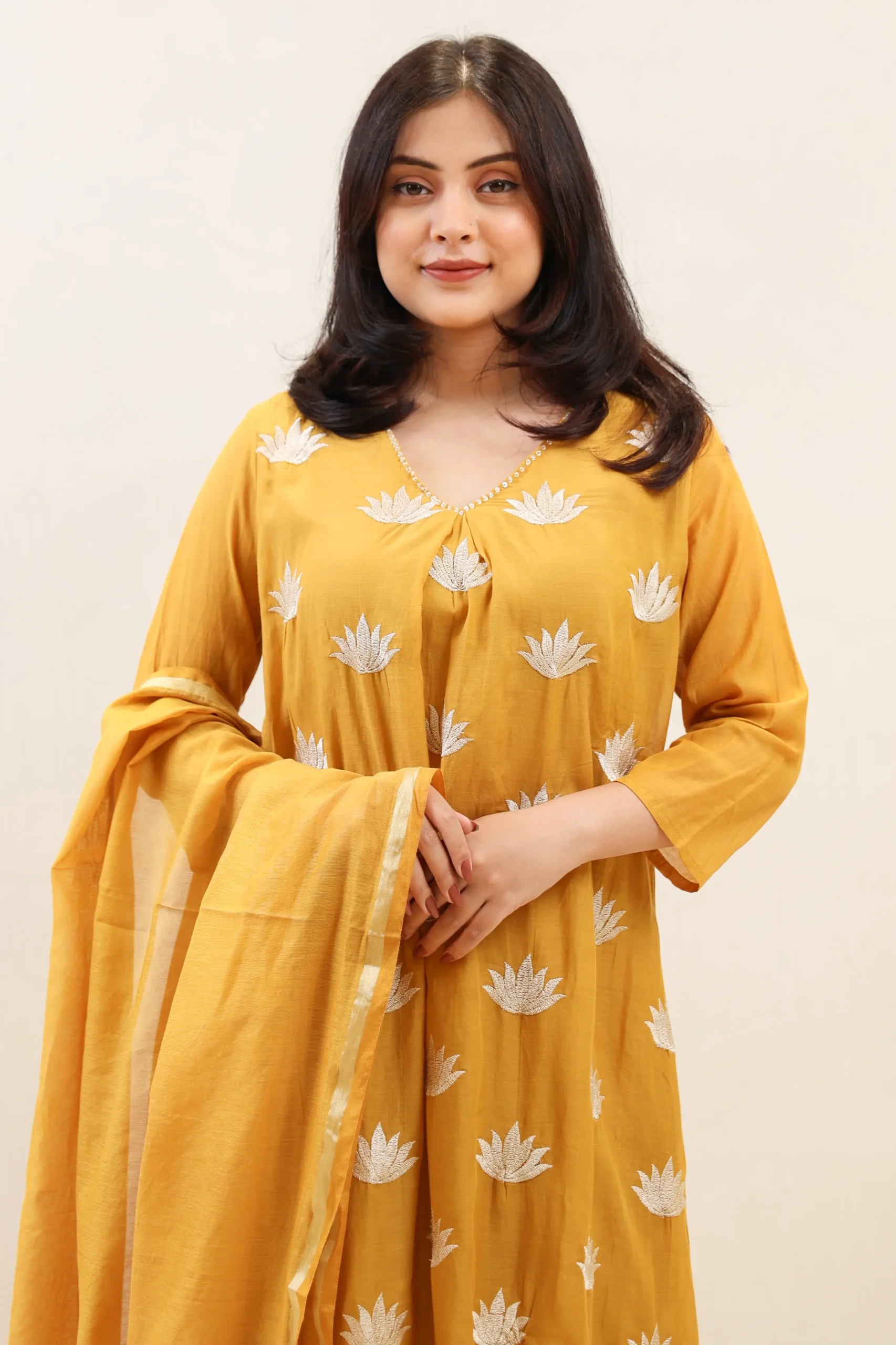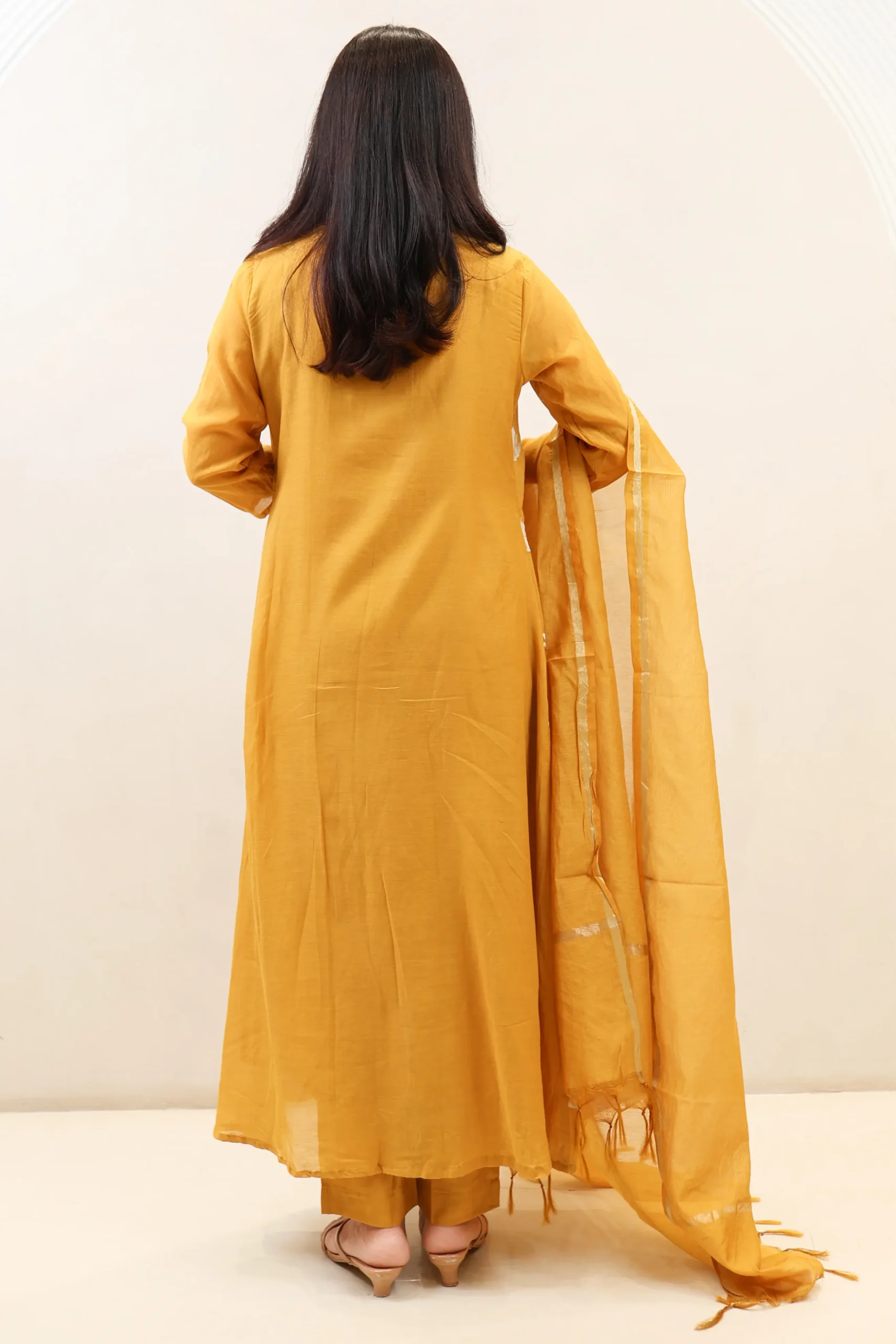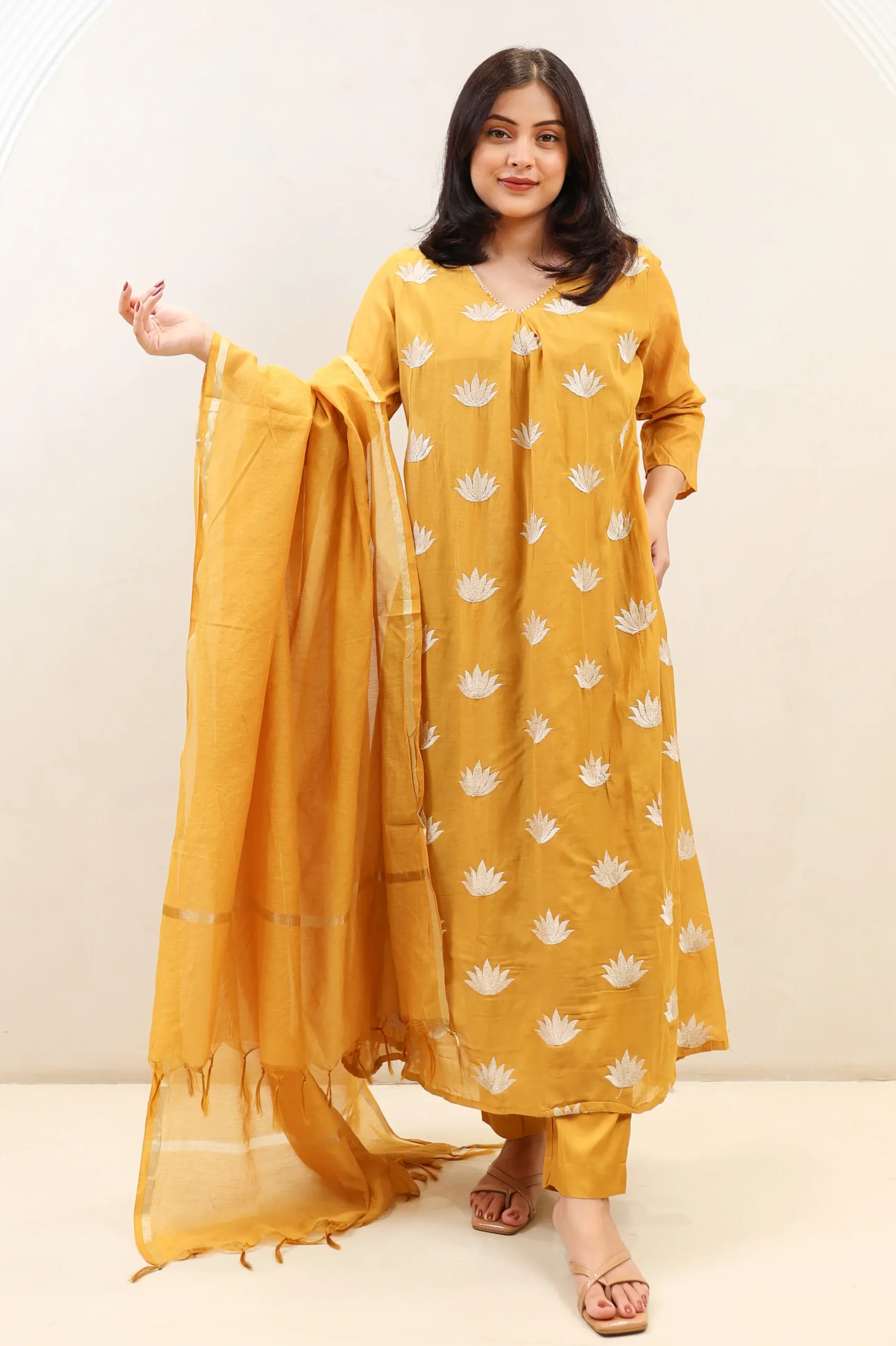 A vibrant Mustard, Magenta, and Rust A-line kurta set designed for daily wear. The knee-length kurta features a V-neck and three-quarter sleeves, enhanced with detailed embroidery and sequin accents. It is complemented by solid cotton pants with a partially elasticated waistband and includes a matching solid dupatta. Made entirely from machine-woven cotton, this three-piece set combines decorative elements with everyday comfort.