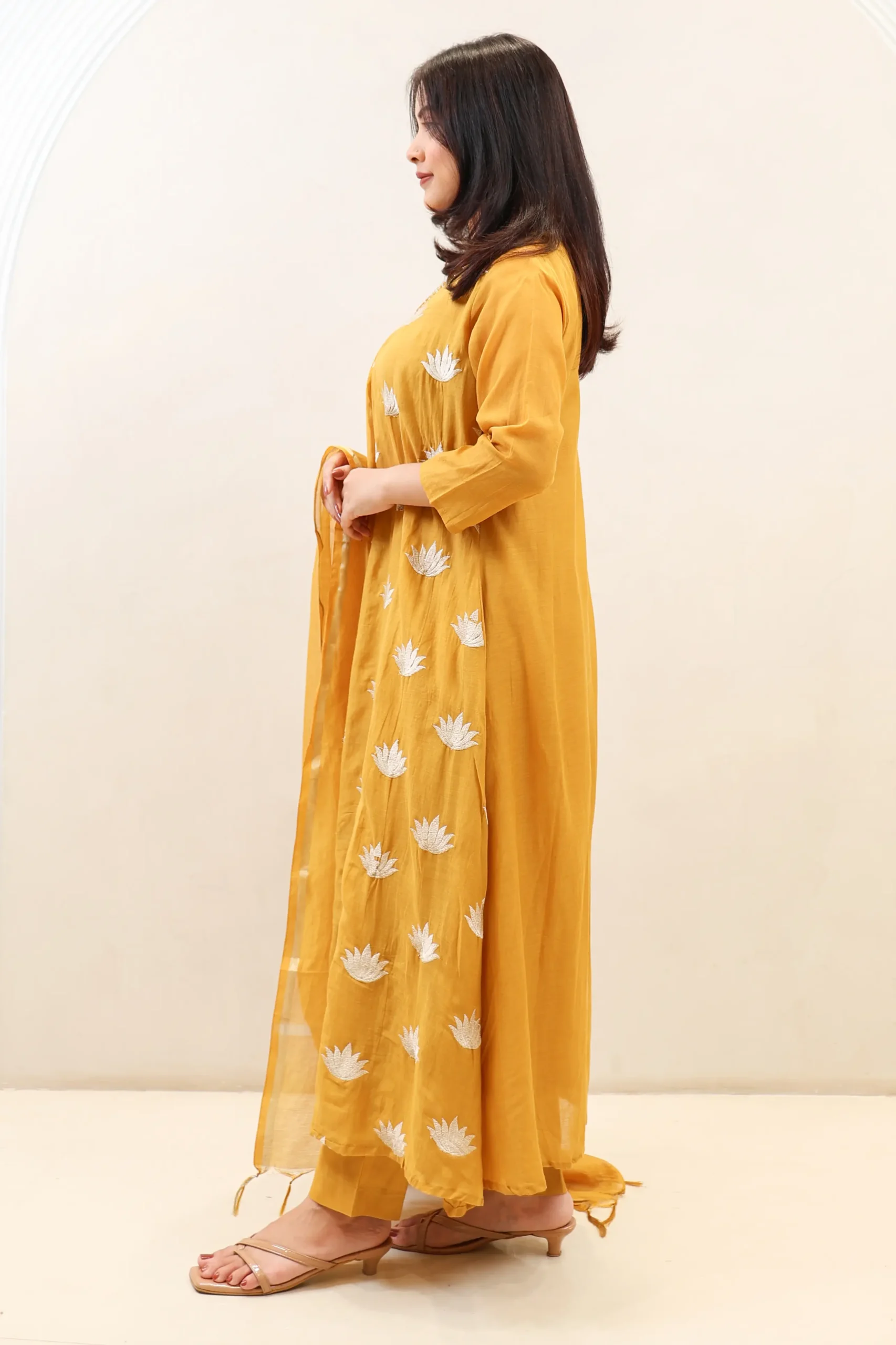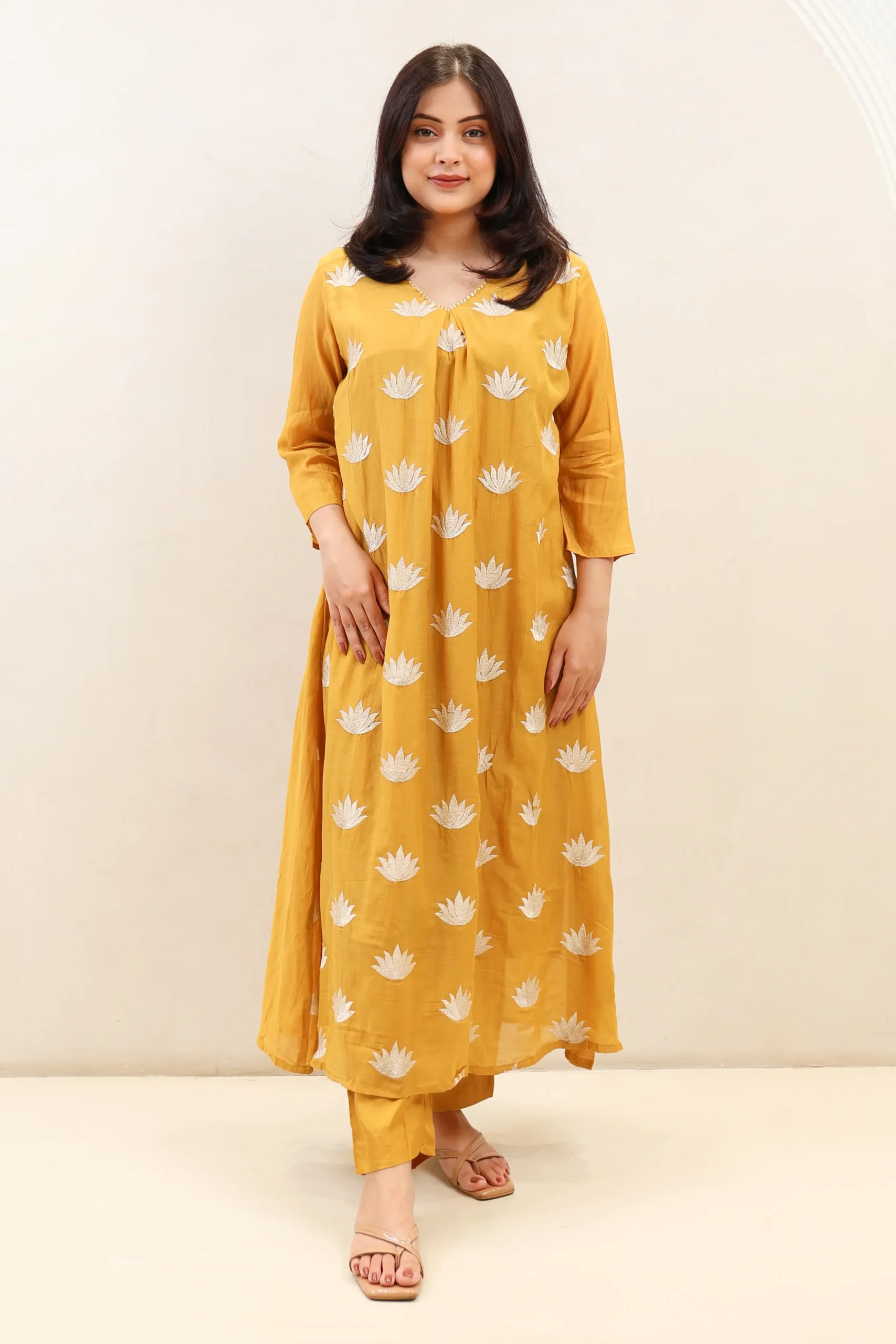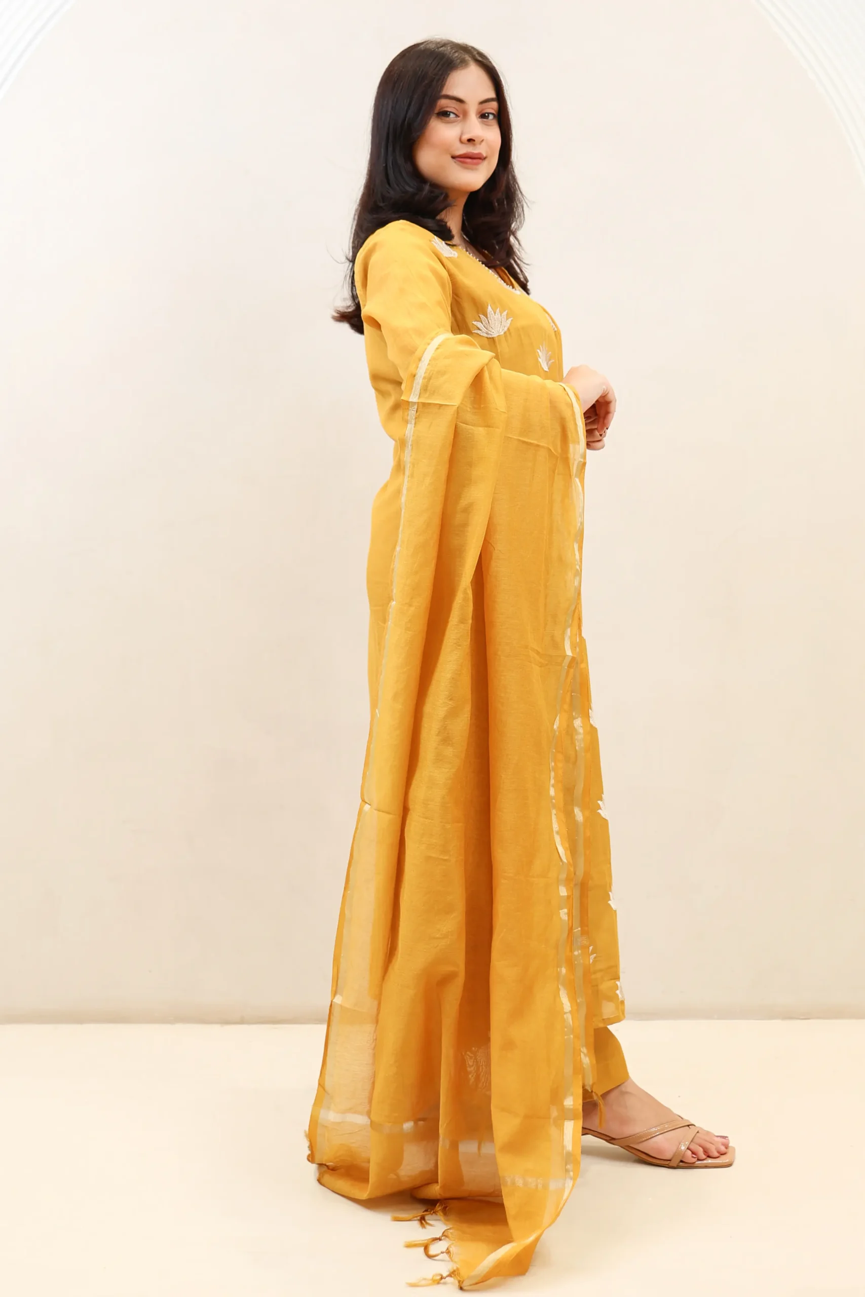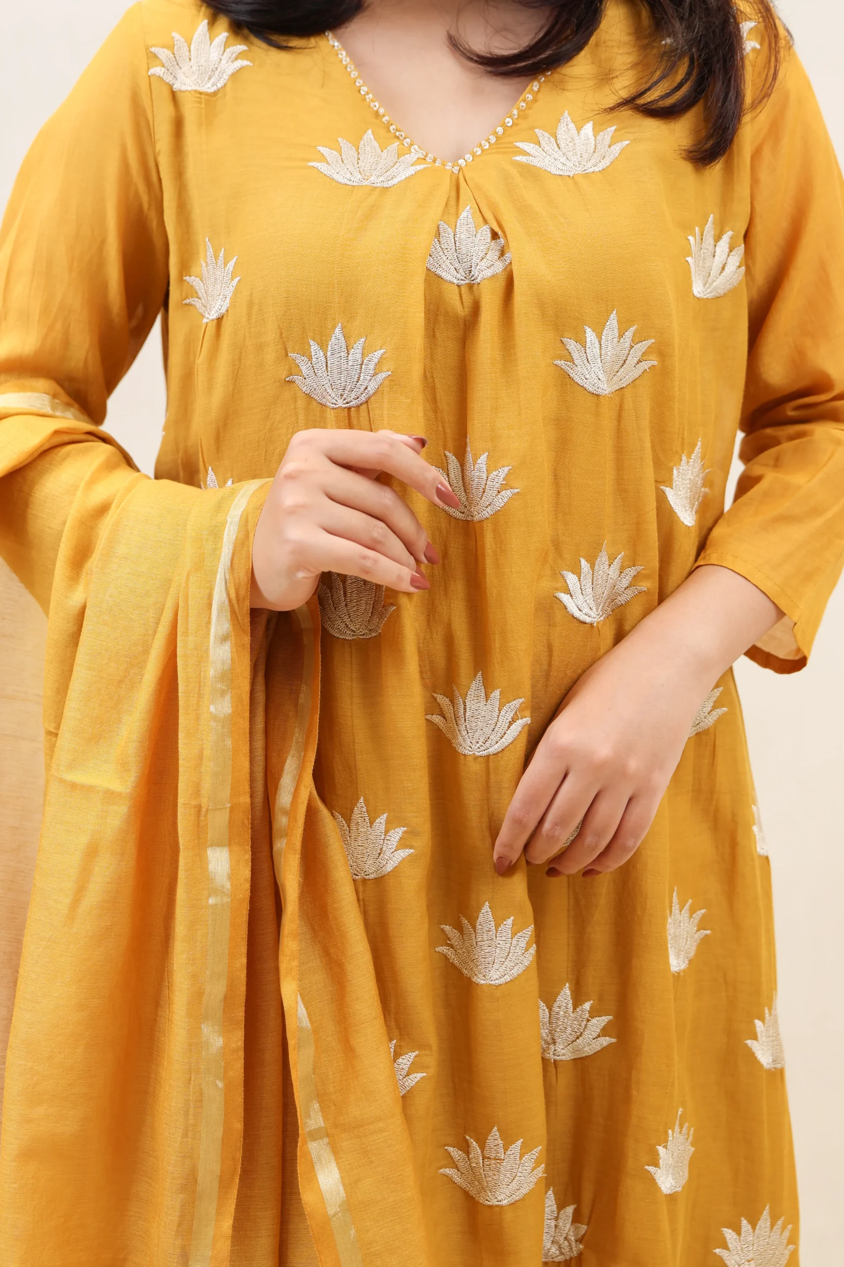 A vibrant Mustard, Magenta, and Rust A-line kurta set designed for daily wear. The knee-length kurta features a V-neck and three-quarter sleeves, enhanced with detailed embroidery and sequin accents. It is complemented by solid cotton pants with a partially elasticated waistband and includes a matching solid dupatta. Made entirely from machine-woven cotton, this three-piece set combines decorative elements with everyday comfort.