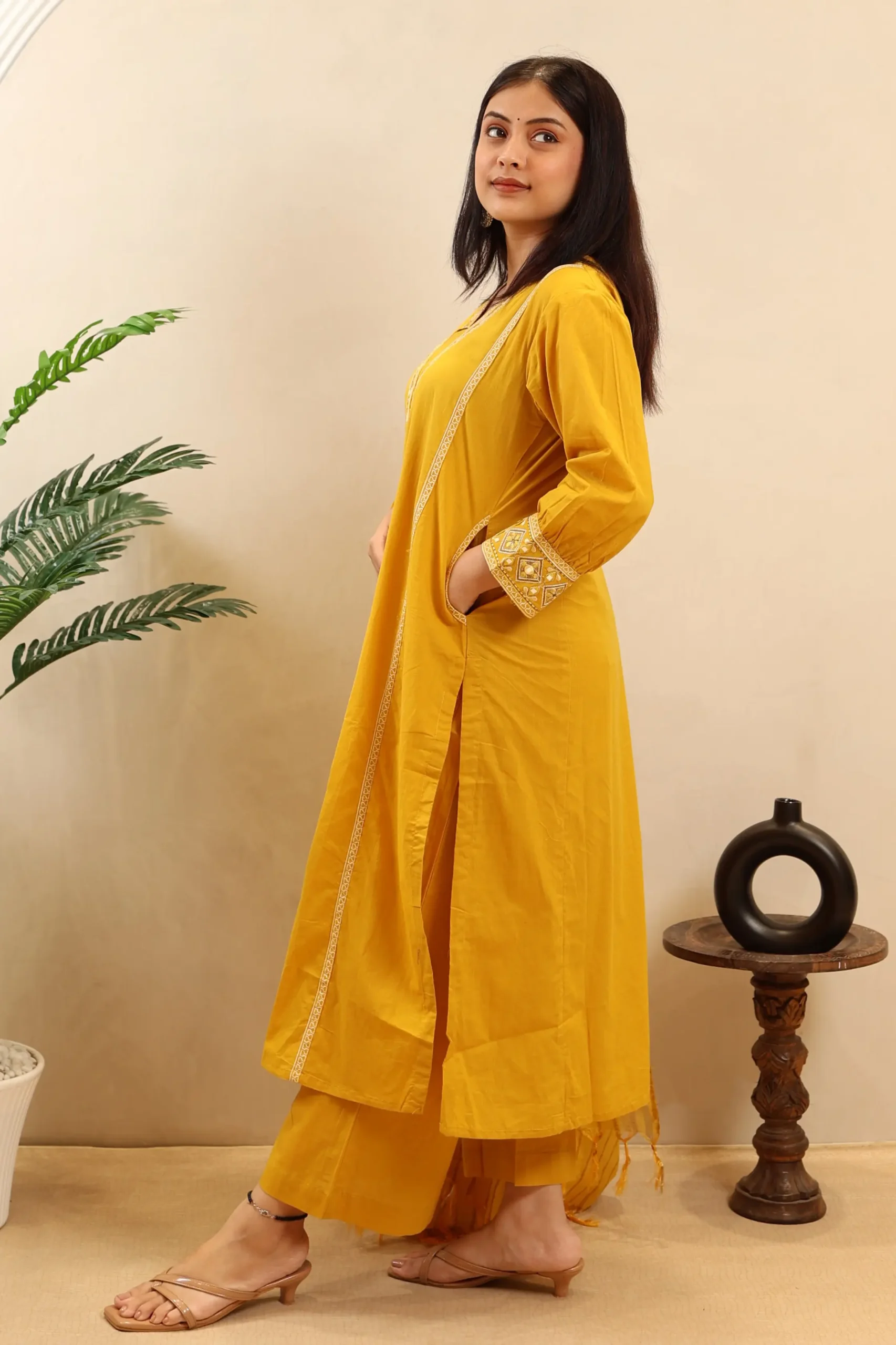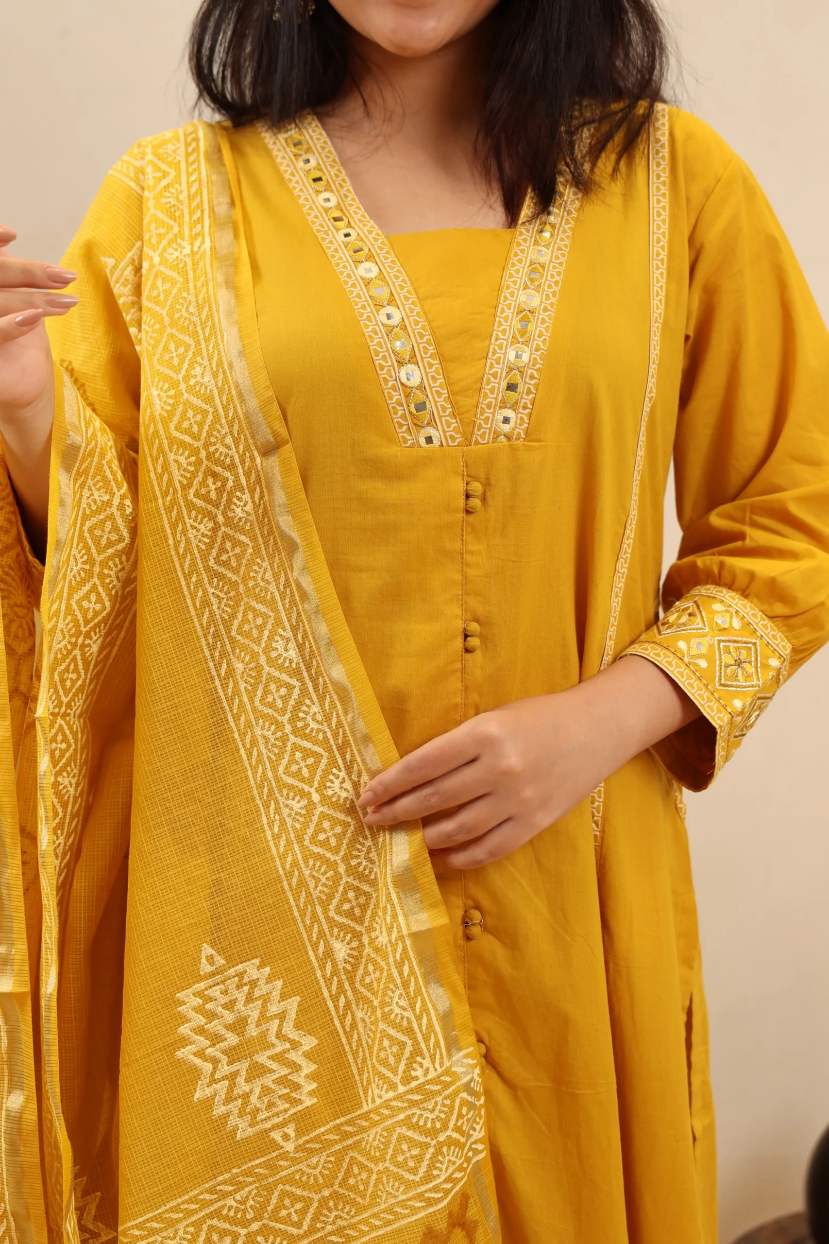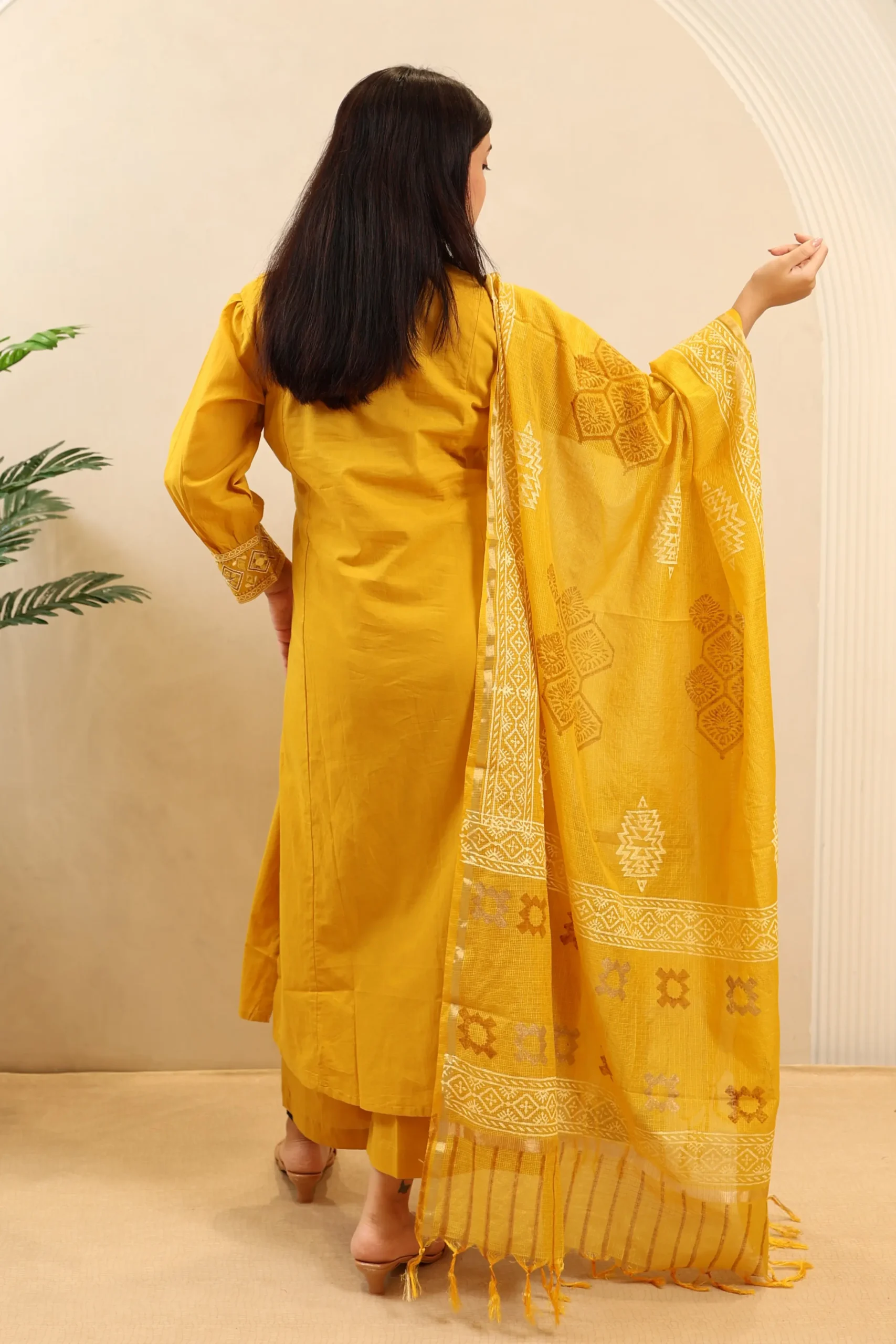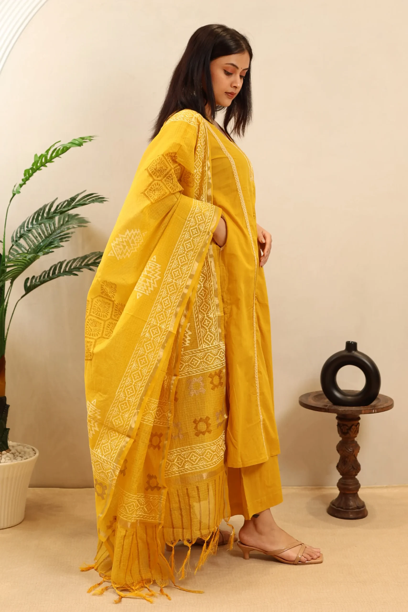 This Mustard A-line kurta set is a perfect blend of elegance and festive charm, ideal for party wear. The soft cotton A-line kurta features a stylish V-neck and three-quarter sleeves, complemented by a beautiful all-over printed pattern. Designed with a knee-length silhouette and straight hemline, it offers a graceful and flattering fit. The set includes solid cotton pants with a partially elasticated waistband for added comfort. Paired with a Khadi cotton solid dupatta, it completes the ensemble with a refined traditional touch. Crafted with machine weave, this outfit promises durability, breathability, and all-day comfort—making it an excellent choice for festive occasions and celebrations.