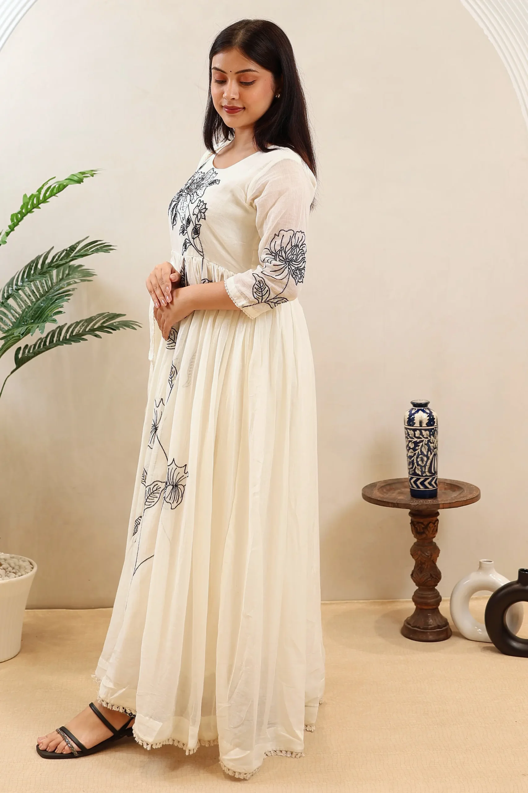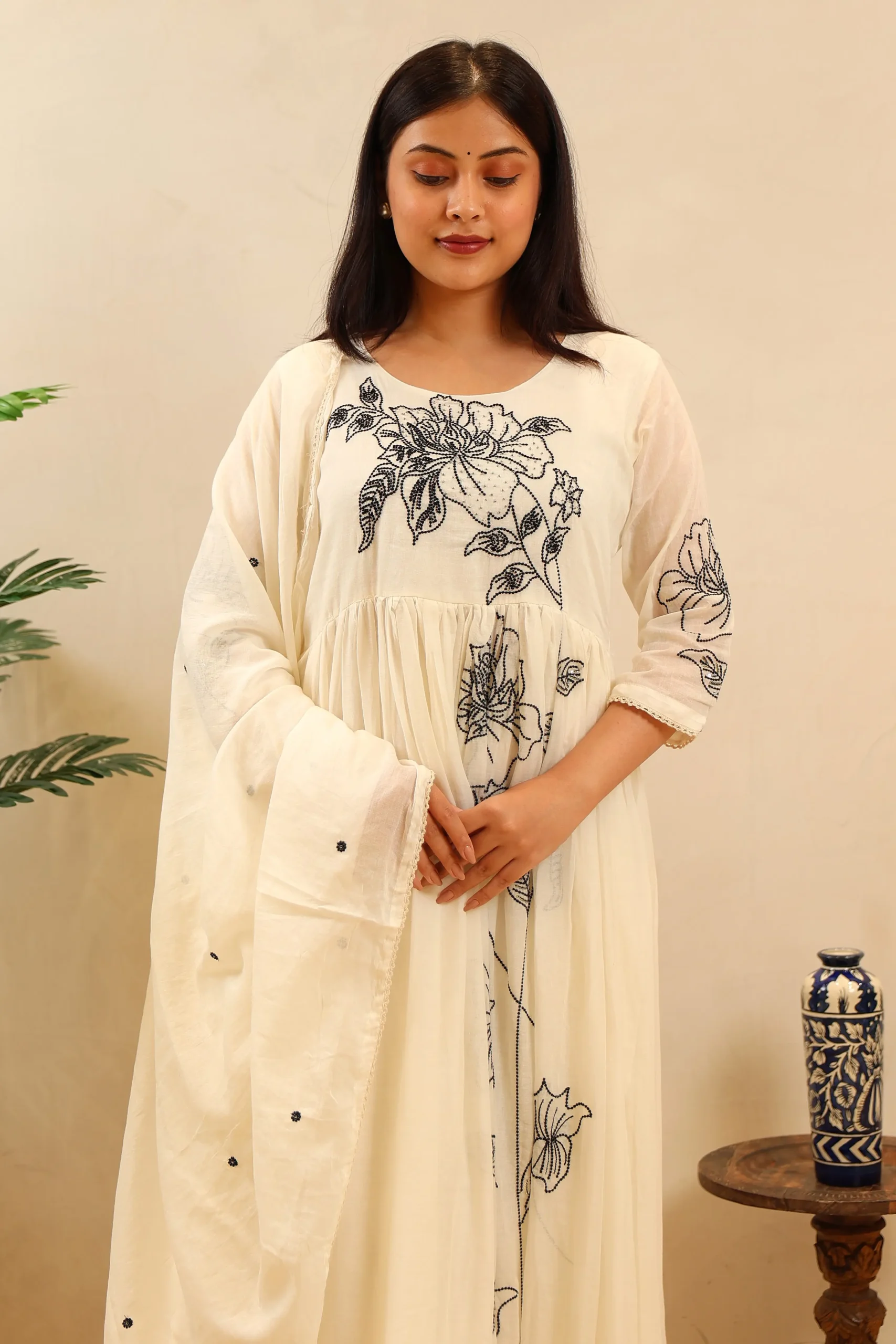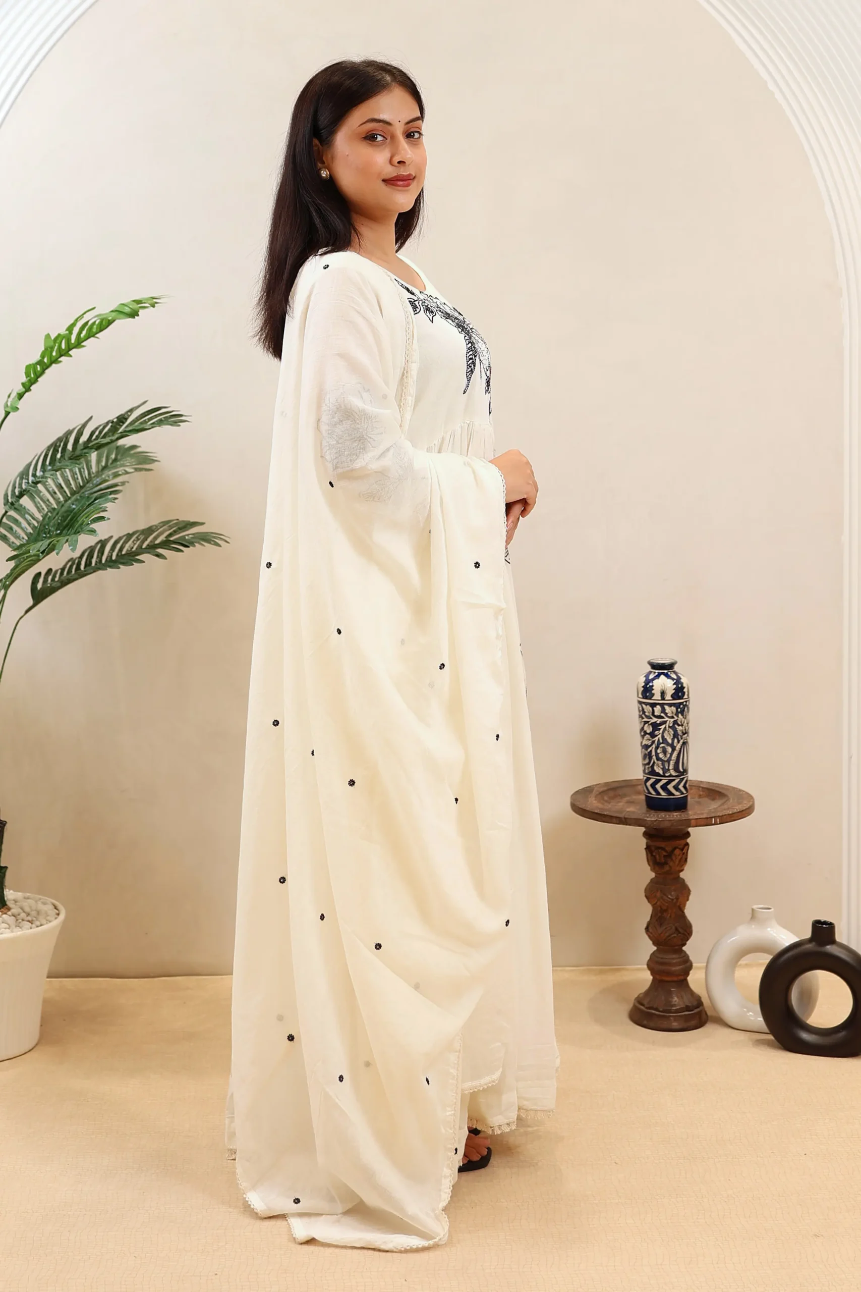 Elegant white embroidered Anarkali set with pant and dupatta—perfect for festive and party wear.