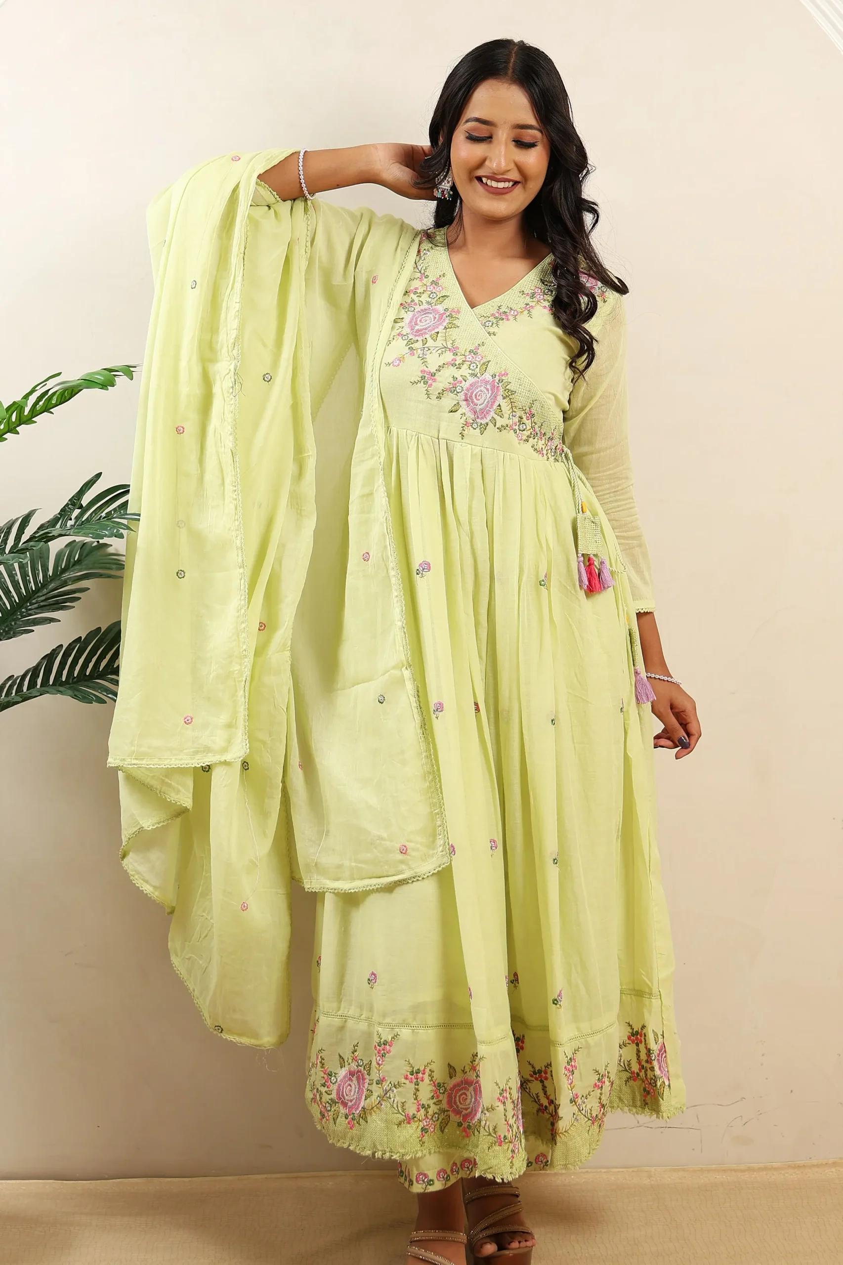 Light Green/Sky Blue/Cream embroidered cotton Angrakha frock with solid cotton pants and matching cotton dupatta, ideal for party wear.