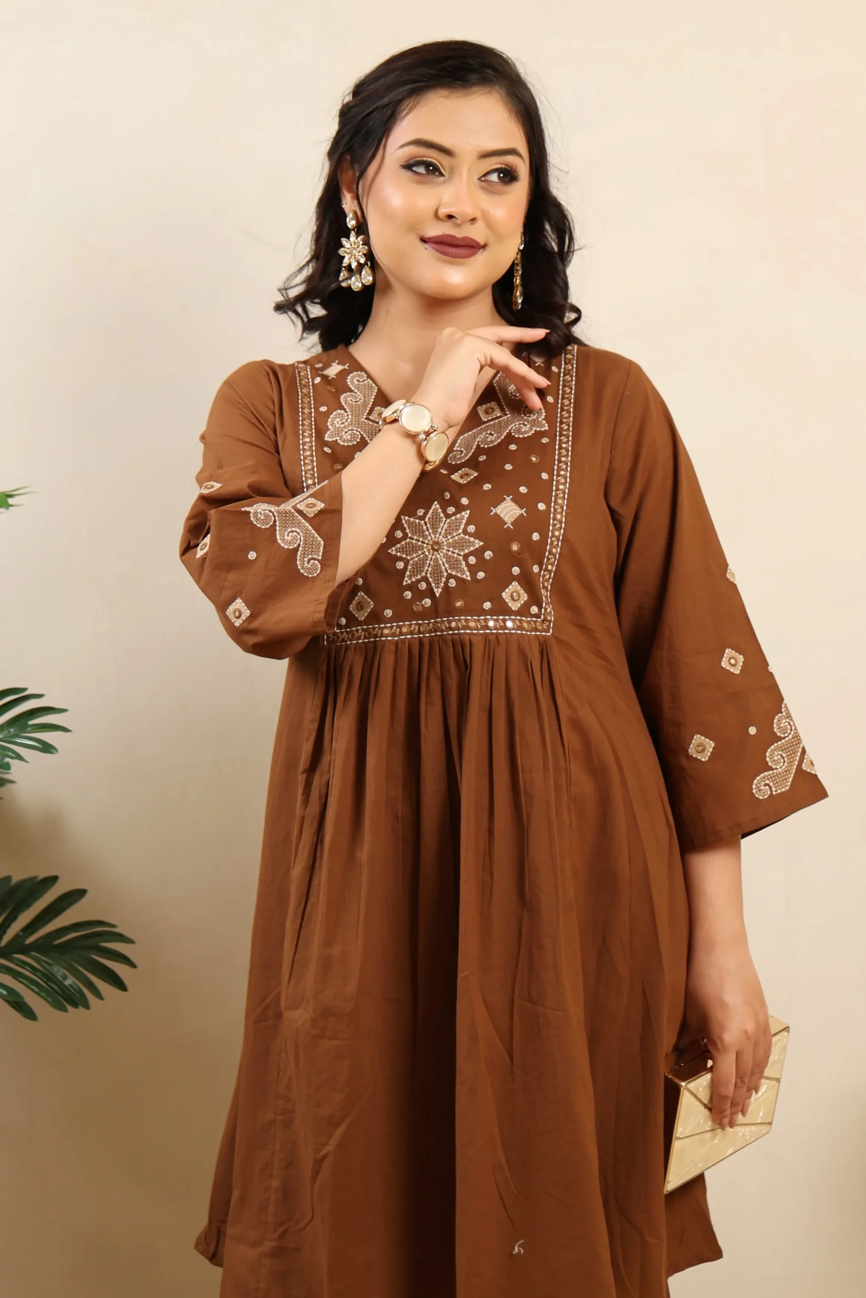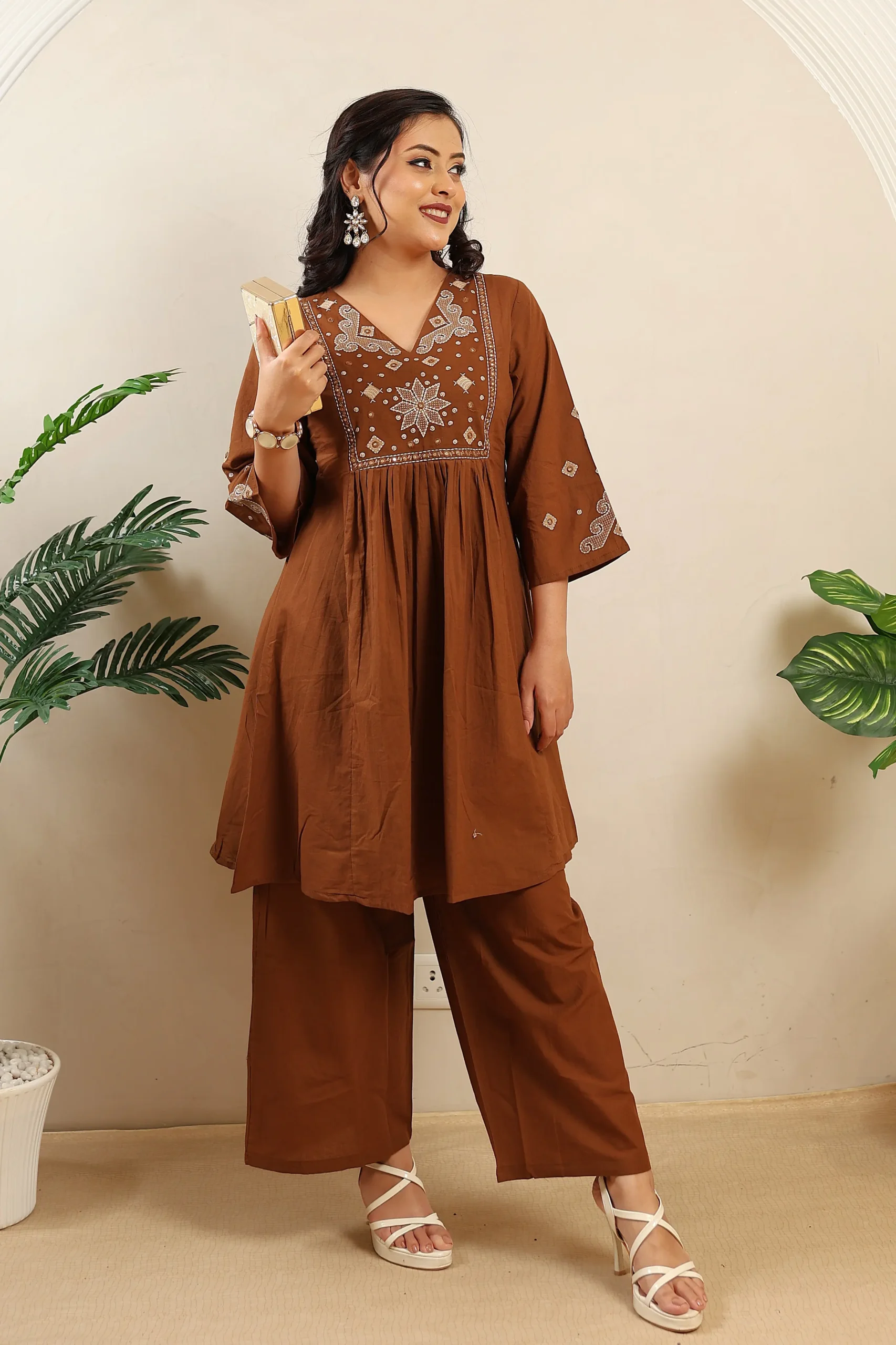This Dark Green/Brown/Purple short frock–sharara set combines comfort with a stylish daily-wear appeal. The knee-length cotton short frock features a printed design, complemented by a V-neck and three-quarter sleeves for a neat and graceful look. Crafted using machine-weave cotton, it offers a soft and breathable feel suitable for everyday use. The outfit is paired with solid cotton sharara bottoms designed with a partially elasticated waistband for comfortable wear throughout the day. This coordinated set provides an easy, functional, and fashionable option for daily outings and casual occasions.