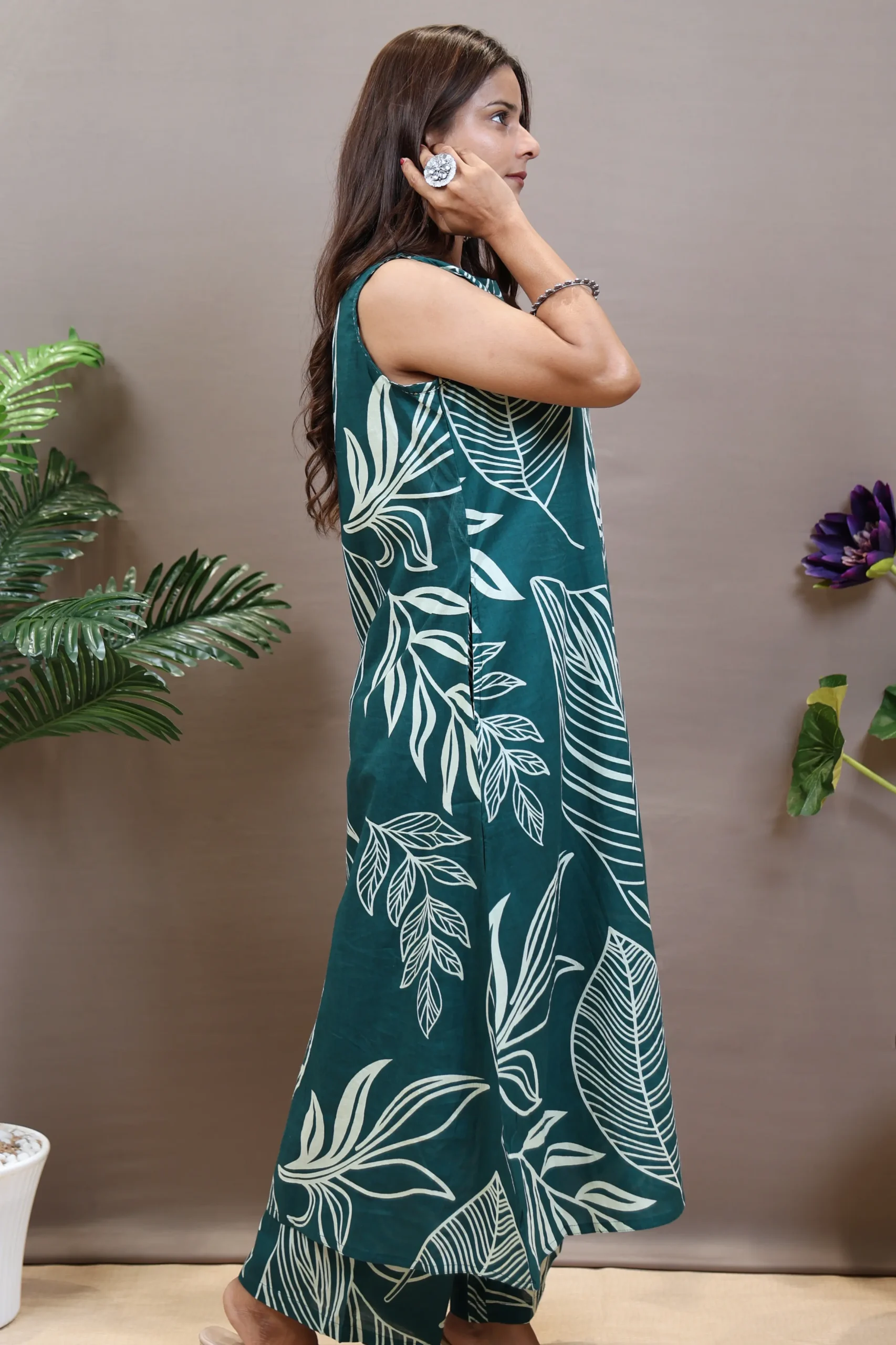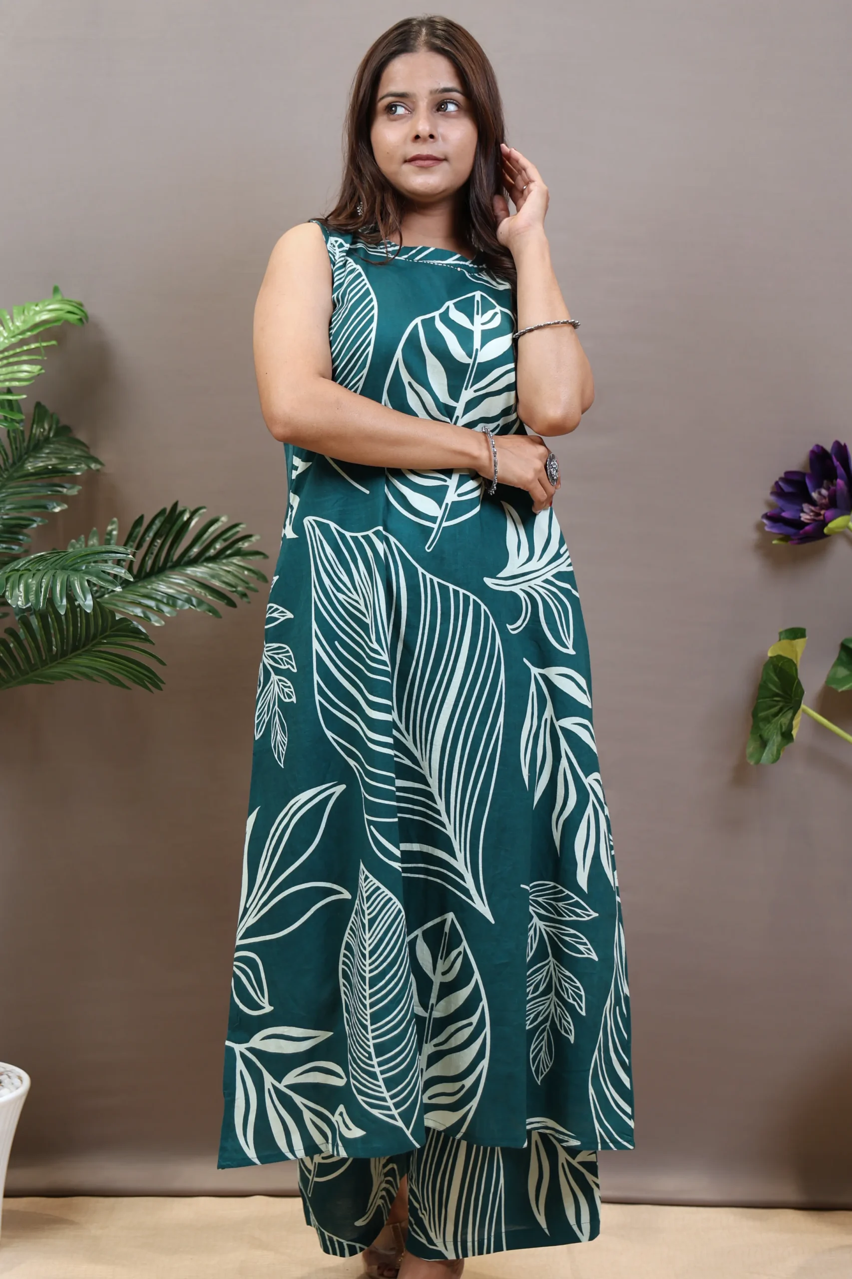 This vibrant Co-ord Set in a bold combination of Rust and Peacock Blue is designed for stylish party wear with a flowy and modern silhouette. The knee-length kurta features a flattering A-line cut and a charming printed pattern, creating a dynamic and fashionable look. With a classic round neck and a sleeveless design, it offers a cool and contemporary style perfect for celebrations. The set includes matching printed cotton plazo pants with a partially elasticated waistband, ensuring maximum comfort and an easy, graceful drape. Crafted with a machine weave for consistent quality, this dupatta-free co-ord set is an effortless choice for festive gatherings, parties, and special occasions.