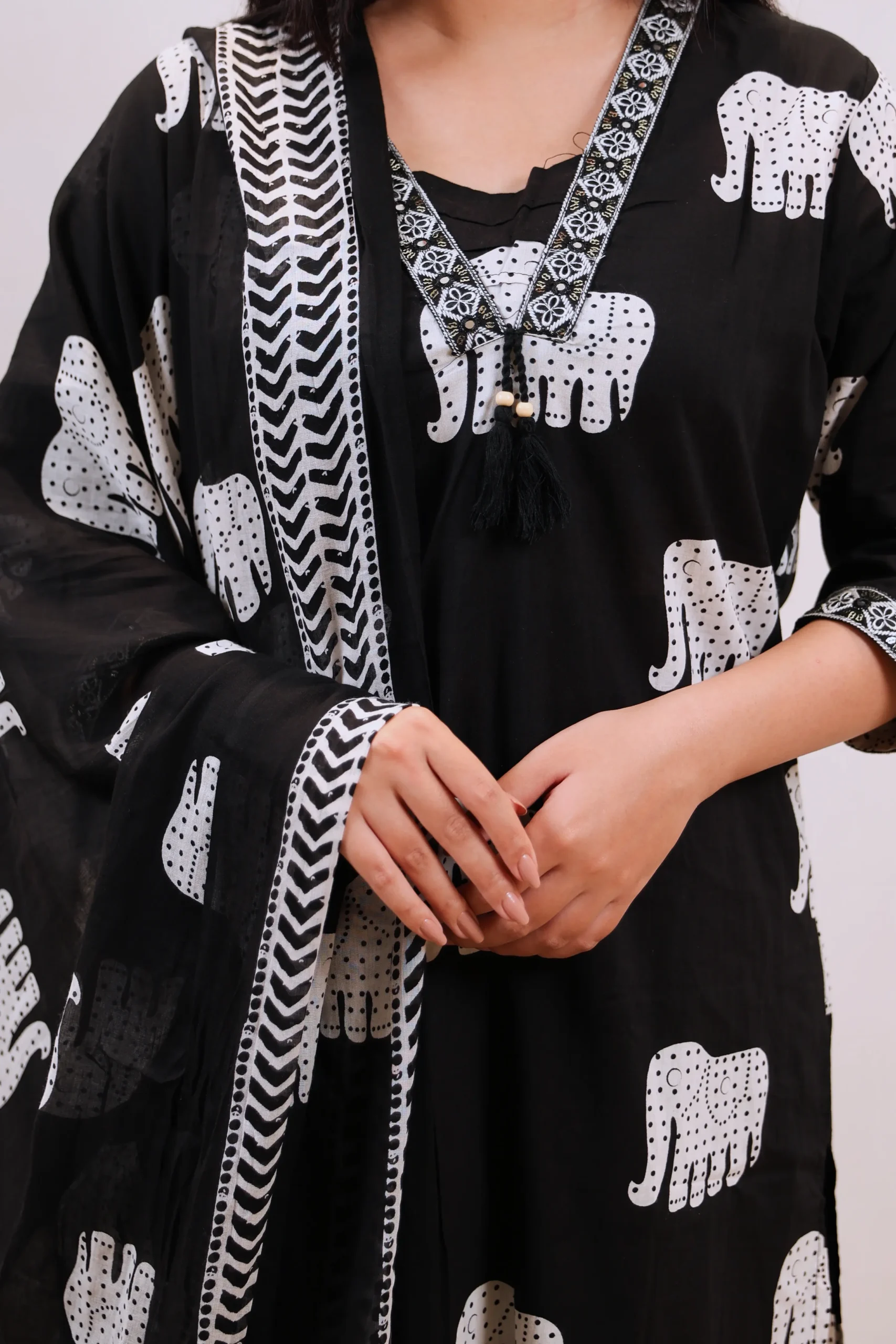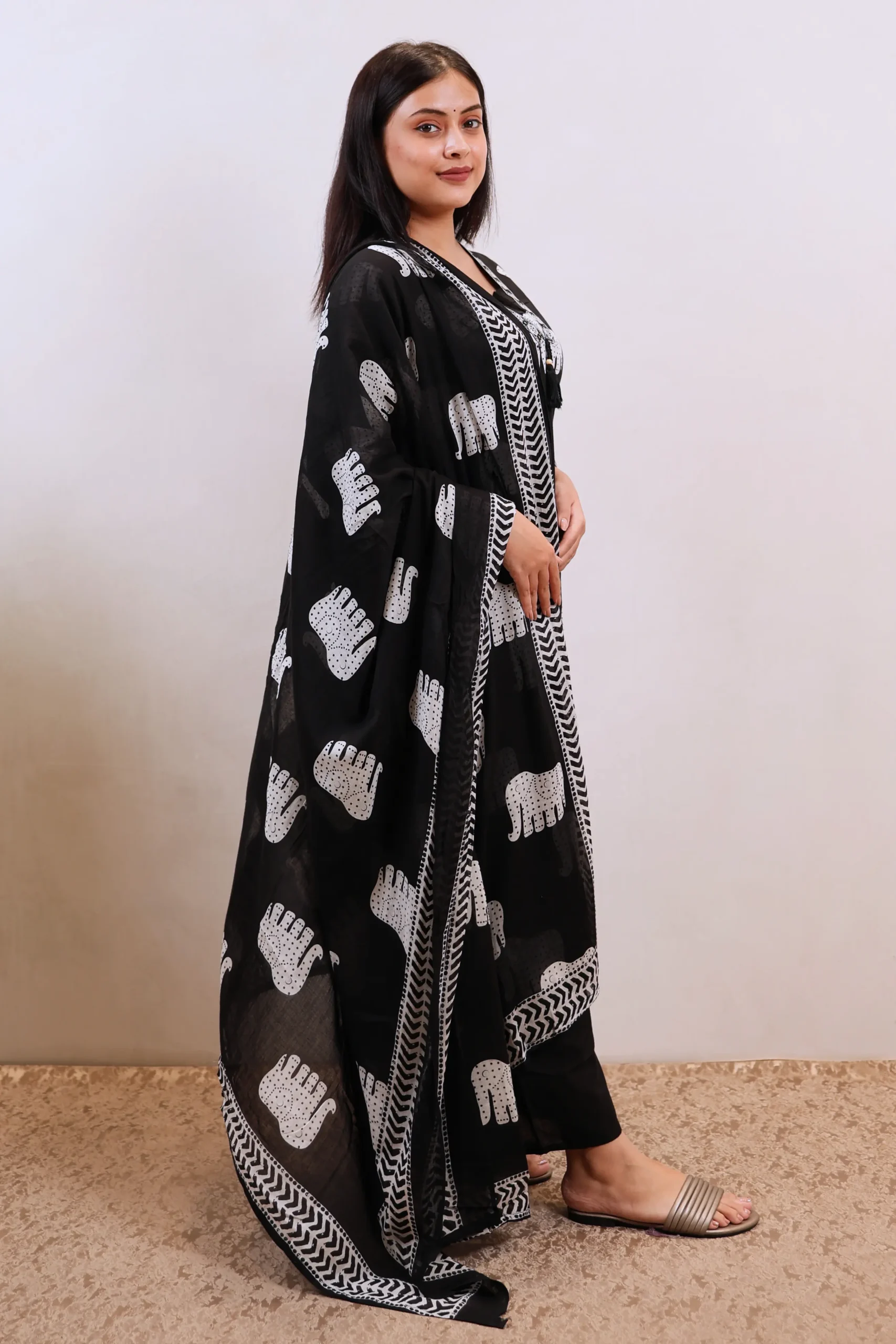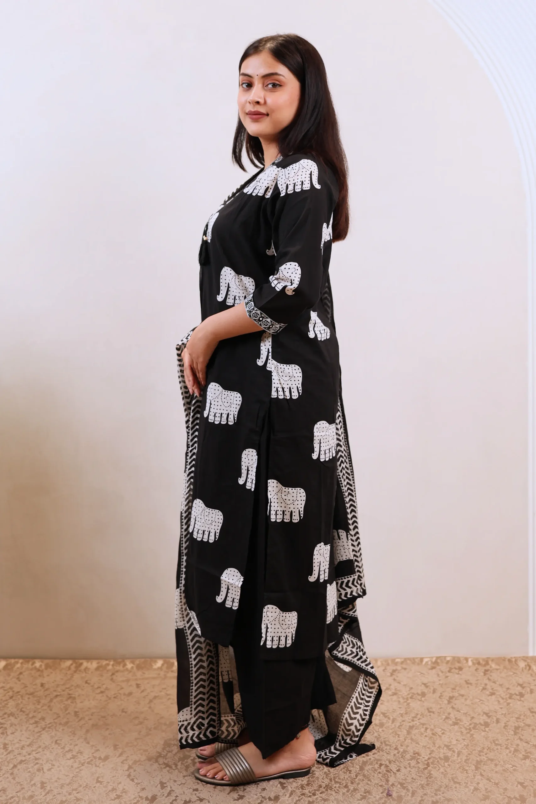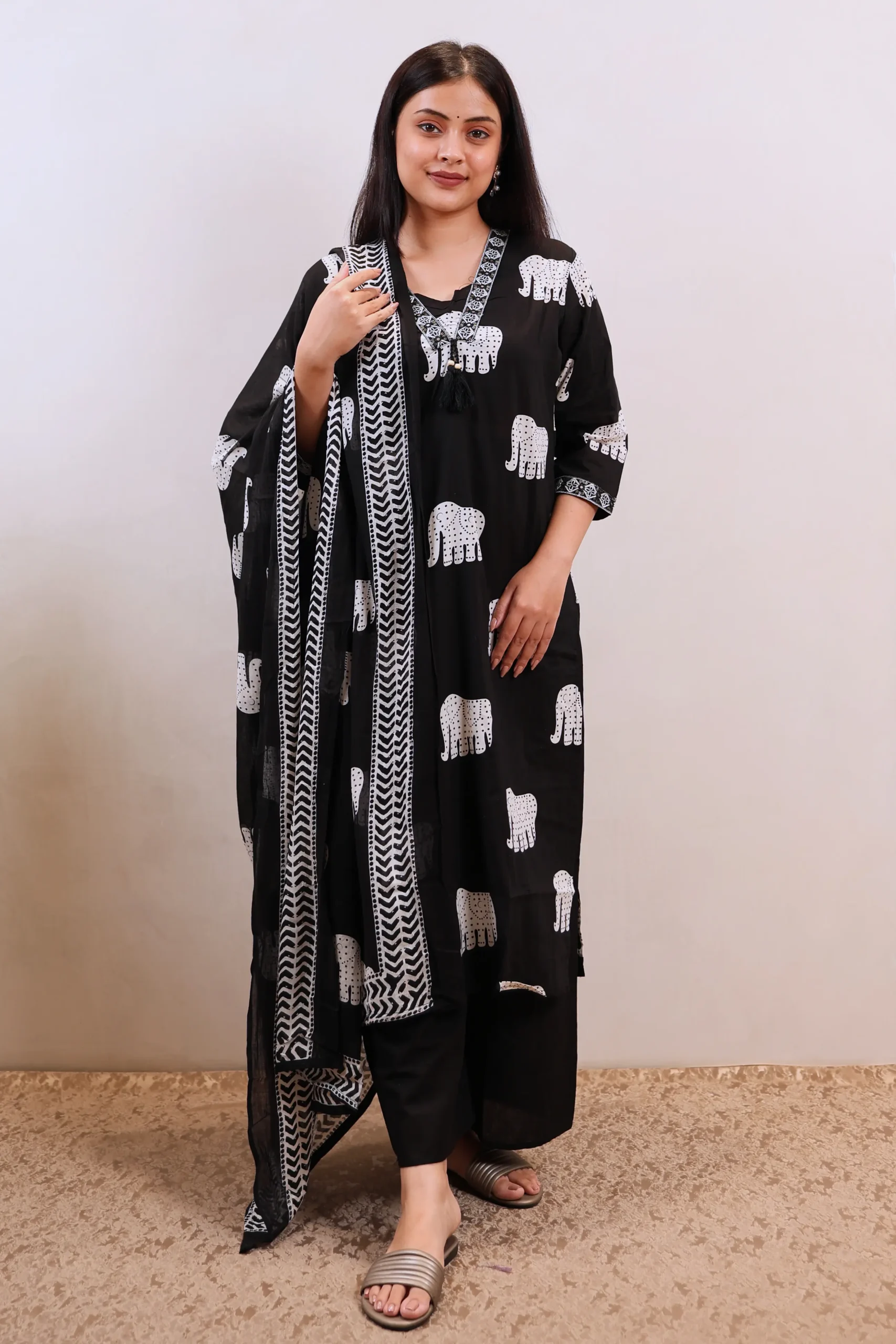 A Black straight kurta set designed for daily wear. The knee-length kurta features a V-neck and three-quarter sleeves with an all-over printed pattern. It is paired with solid Plazo pants featuring a partially elasticated waistband for comfort, and includes a printed dupatta. Made entirely from machine-woven cotton, this three-piece set offers versatile styling for everyday occasions.