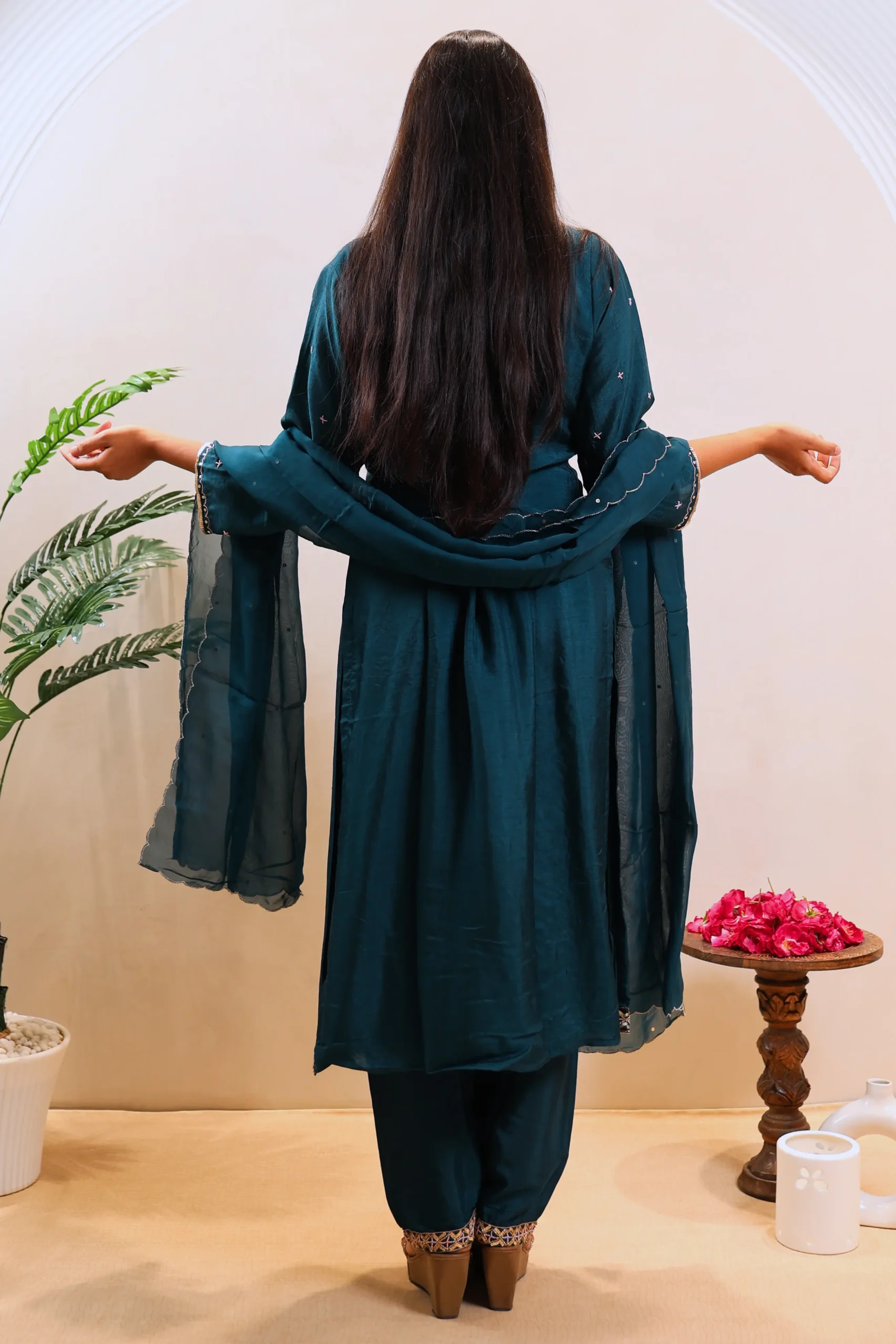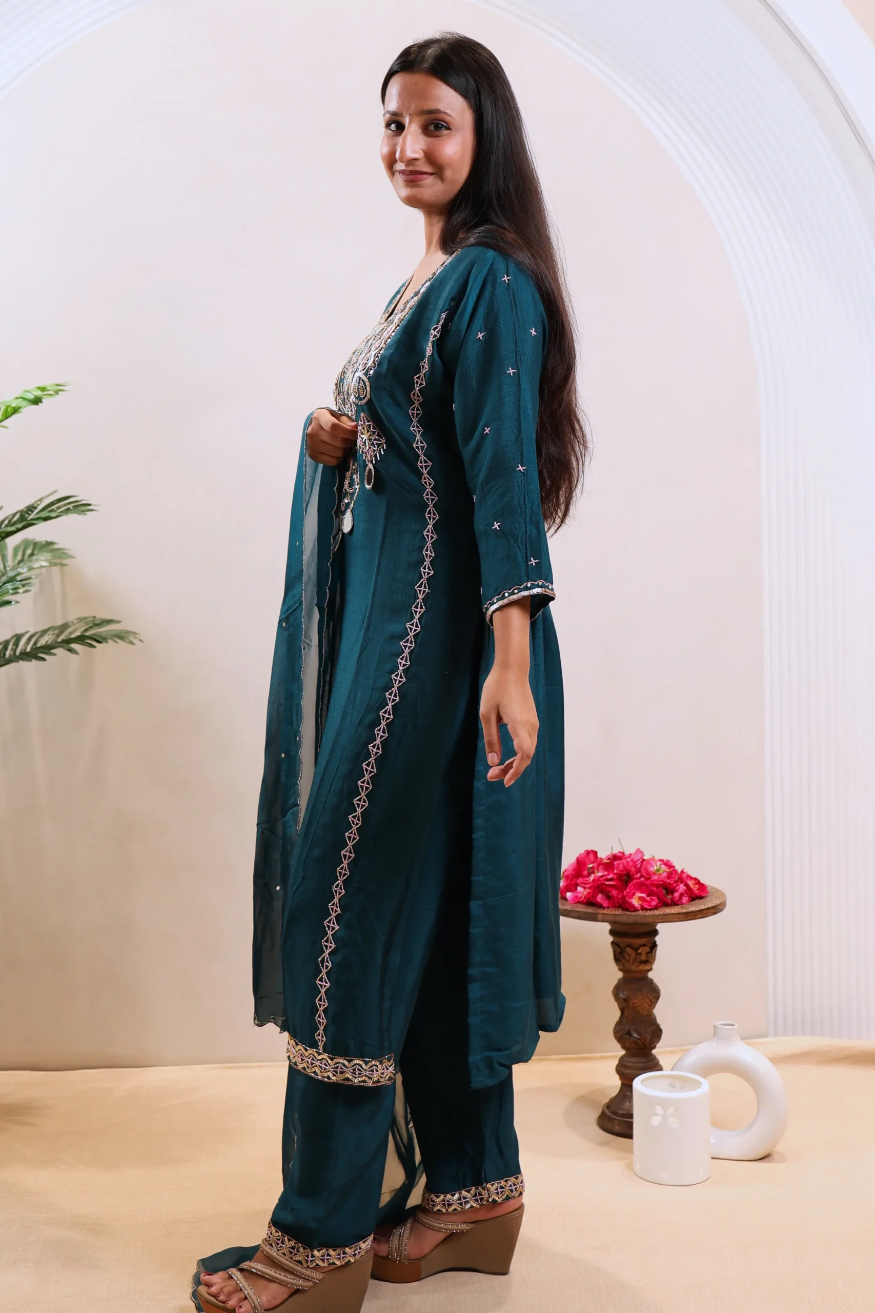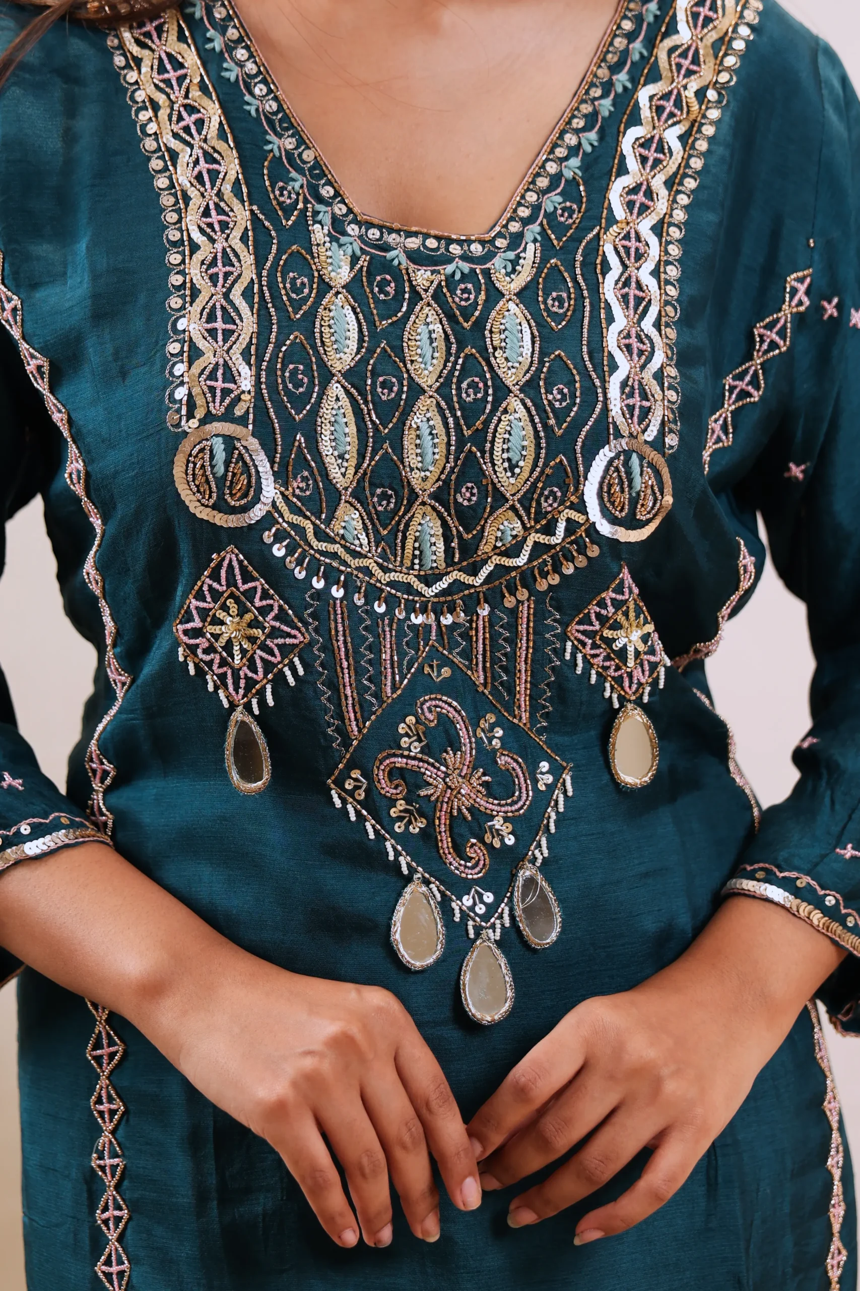 Three-piece Peacock Blue set with embroidery and sequins