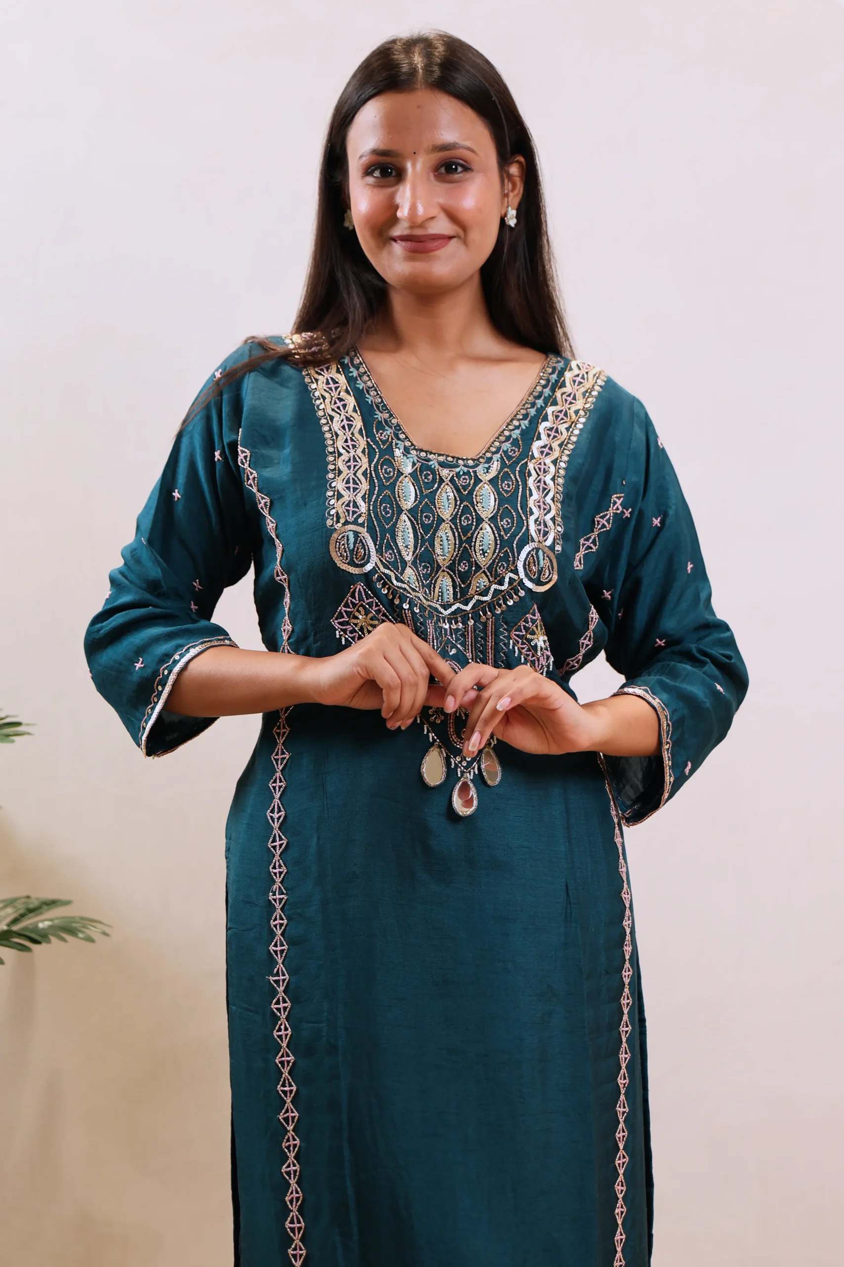 Straight kurta with V-neck and three-quarter sleeves